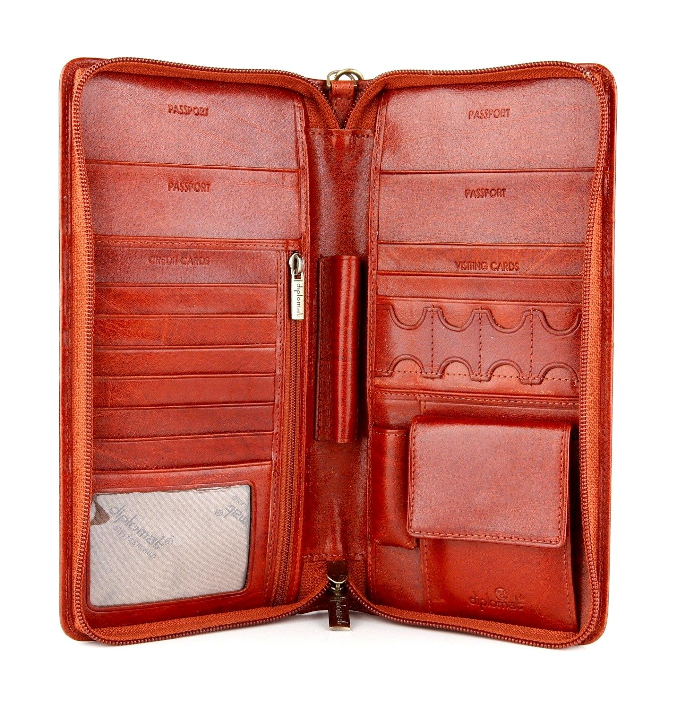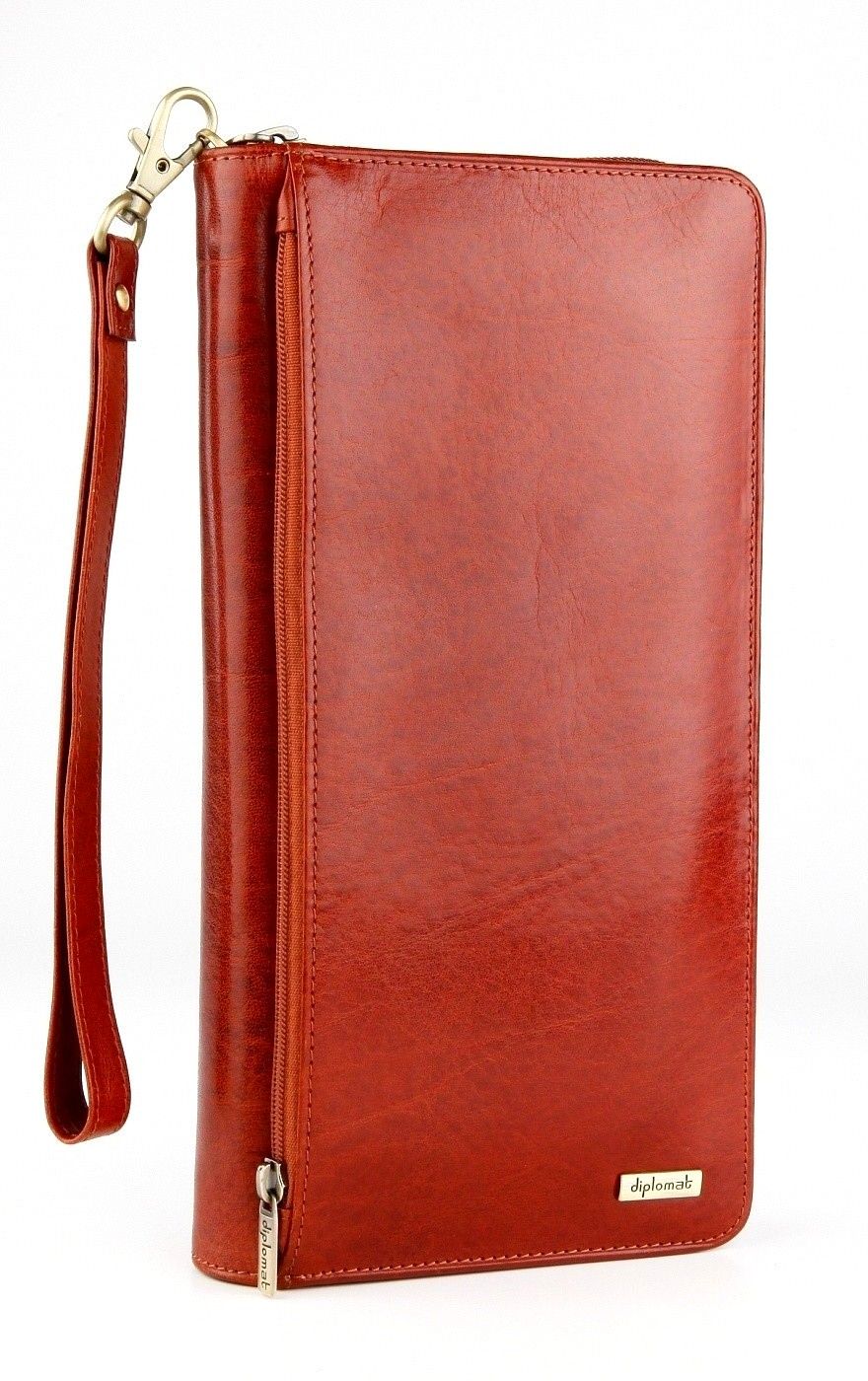 Diplomat представляет: портмоне для путешествий SK-1866B из натуральной кожи, рыжего цвета «vegetable» выделки, имеет внешнее отделение на застёжке + карманы для документов и авиабилетов. Внутри 2 больших для купюр + на молнии + 4 для паспортов + 9 для банковских пластиковых и визитных карт + для монет на кнопке + крепления для авторучки, флеш и SIM карточек + прозрачное для фото + специальный ремешок с карабином для ношения на руке. Купить кожаное дорожное портмоне в интернет магазине официального сайта Дипломат Швейцария (лучшая цена с доставкой) в Москве.